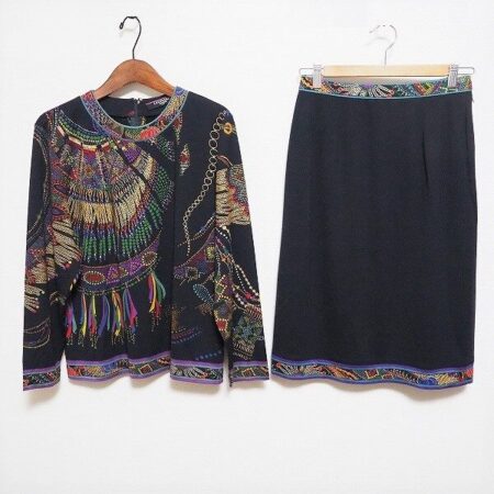 出張買取にてレオナールのセットアップを買取しました。豪華すぎて見とれる柄がポイントです。スカート部分はシンプルなので飽きも来ずセットで使いやすい工夫が素敵ですね。