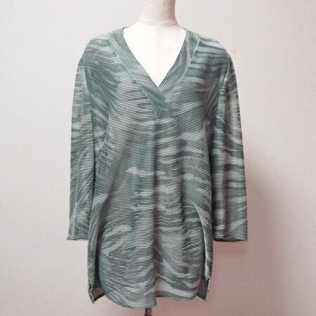 伊太利屋の大きめサイズ(15)の 長袖カットソーを買取いたしました。白×緑の柔らかく落ち着いた色味と曲線の多い総柄が魅力的な1枚。しなやかでゆったりシルエットはお家の中で着たら気持ちがやすらぎおうち時間が一層快適になりますね。深めのVネックなので重ね着をが好きな方にもお勧め!