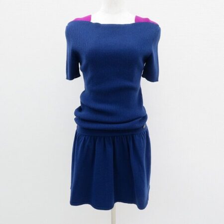 華奢な方も嬉しいサイズ36のシャネルのワンピース。出張買取ご利用のお客様より買取しました。落ち着いた青に明るい紫が良く映えています。リブニットなので程よくゆとりがありつつ体の線を綺麗に見せてくれます。