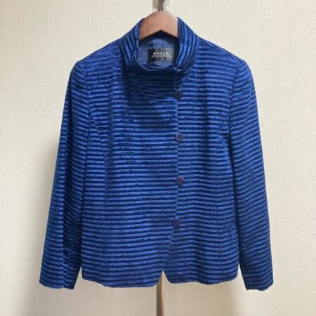 出張買取サービスにおいてマダムジョコンダのジャケットを買取しました。寒々しくもパキッと映える綺麗な青。細かなボーダーがほどよいアクセントとなりカッコよく着ていただけます。
