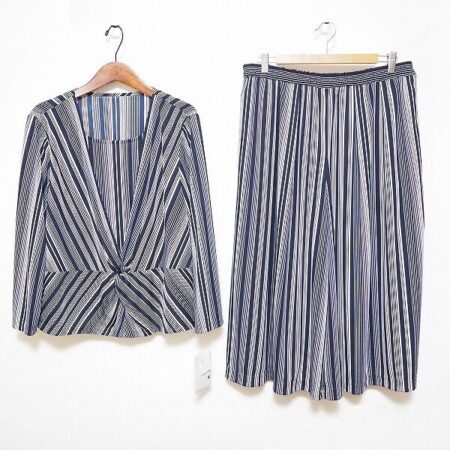 出張買取にてレリアンのセットアップを買取しました。紺と白のはっきりとしたストライプが特徴です。どこか派手ではありますが落ち着きがあり程よく楽しませてくれるお洋服ではないかと思います。ボトムスもワイドパンツで使いやすくよいですね。