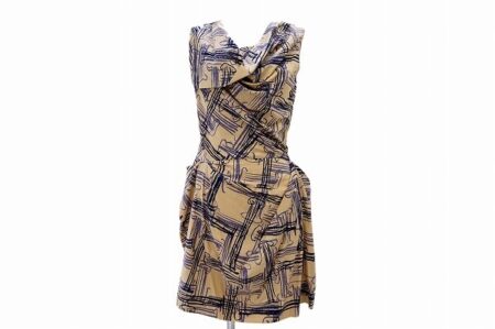 ヴィヴィアンウエストウッドのワンピースを出張買取にて買取しました。ベージュと紫の組み合わせが珍しいワンピース。高貴さを感じつつもどこかカジュアルな雰囲気にもなります。贈り物の包み紙のような遊び心満載な柄がおしゃれを楽しくしてくれますね。