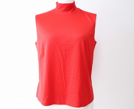あざやかな赤のワンカラーのカットソーはノースリーブでハイネックデザインで夏に1枚で着るのは勿論、重ね着にも重宝するディテールです。コーデに赤が加わるだけで血色良く若々しい印象にしてくれますので是非、取り入れてみて下さいね。
