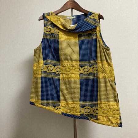 イム センソユニコ シャツを買取しました。サイズは40です。黄色と紺色の組み合わせががちっとハマったシャツ。ノースリーブなので程よい豪華さで着ていただけます。