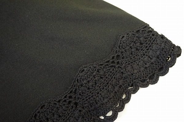 スカートのすそ部分はレース仕立てになっていてとても女性らしい雰囲気です。黒一色ですがニット素材・ノースリーブ・レースでとても涼しげですね。スカート丈も程よいので春夏には大活躍しそうなワンピースです。