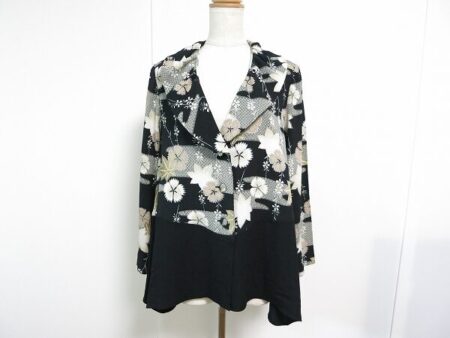 詩仙堂 ヒトシタムラのジャケットを出張買取ご利用のお客様より買取しました。落ち着いたモノトーンのジャケットにもかかわらずどこか華やかで品があり厳格のある大人な女性に仕上げてくれる1着です。ちりめん素材にこだわりのあるヒトシタムラのお洋服は日本女性の美しさ、強さを綺麗にみせてくれるアイテムばかり。着物のような絵柄も多く見ている方も楽しくなります。