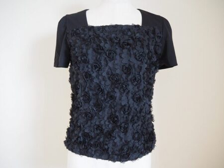 美しくエレガントな花モチーフが素敵なカットソー。出張買取にて買取しました。たくさんの花柄が詰まっていますが 黒なのでしっとりと仕上がっていていい感じですね。首元も丁度よく開いているのでジュエリーも楽しんでいただけます。