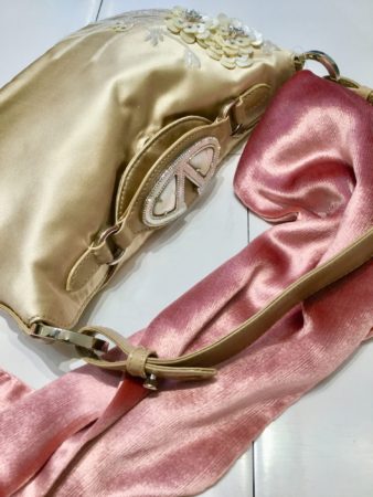 パーティーといえばやはりヴァレンチノは外せないので、もうひとつバッグをご紹介しましょう。ヴァレンチノのロゴに偏光パールを使い、本体にはスパンコールと花の刺繍、サテン素材は上品なシャンパンゴールド…というどこまでもロマンティックなヴァレンチノなのです。