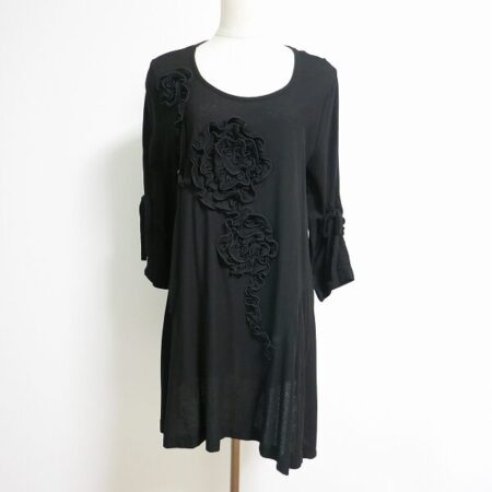 イークラットは近藤英子氏が手掛けるアパレルブランド。シンプルなのに大人な品のあるファッションを提供してくれるありがたい存在です。ご紹介するのは出張買取で買取したシンプルなチュニック。しかしよくよく見るといい具合にお花モチーフがあり、可愛らしさを加えてくれます。裾のフリルも上品です。