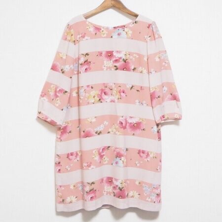 ローズティアラのワンピースを宅配買取ご利用のお客様より買取しました。可愛く綺麗なピンク。そしてボーダーと花のコラボの珍しさにも注目の1着です。真ん中でベルトをして引き締めながら楽しむのもおすすめの着方です。
