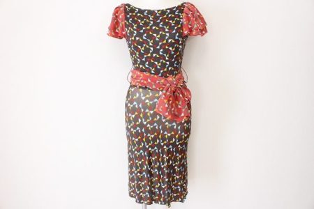 まばゆいカラフルな柄とバイカラーの袖とウエストリボンのデザインが大人の遊び心満載です。