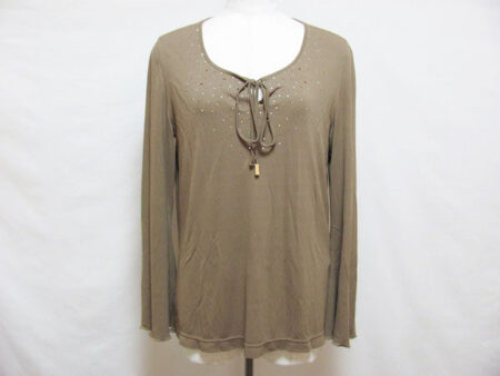 伊太利屋のカットソー サイズ9号のアイテムを出張買取にて買取しました。使いやすい色合いのカーキ。胸元にさりげないリボンがあるため可愛らしさもアピールできるのが嬉しいですね。ちょっとしたラインストーンも綺麗めな雰囲気を感じられます。
