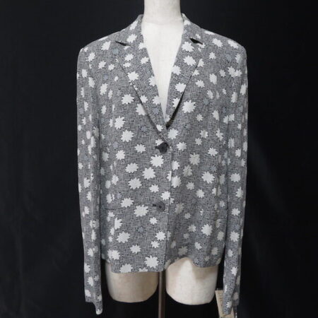 変わった絵柄が素敵なマックデイビッドのジャケット。出張買取ご利用のお客様より買取しました。サイズは48です。黒と白の組み合わせですがほどよく柔らかさも感じさせてくれる1枚です。インナーはカラーを合わせていただいてもいいですね。レースなどキュートな感じも可愛いかと思います。