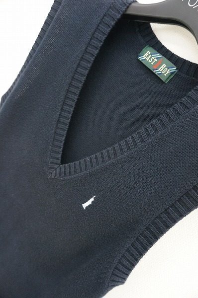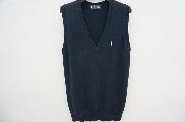 今回、こちらでご紹介させていただくのは、イーストボーイの紺色のベストになります。イーストボーイらしい仕上がりで、おなじみのロゴマークもデザインされています。こちらのアイテムは、綿100%で作られているので、着心地も良く、速乾性にも優れており、肌にも優しいんです。