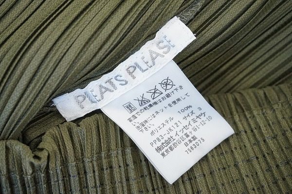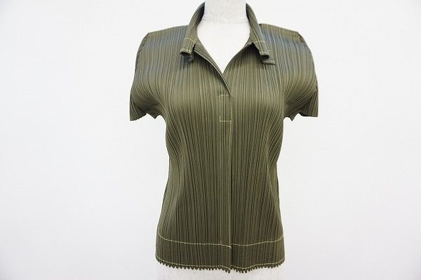 落ち着いたモスグリーンがプリーツによって、わずかに光沢を伴っているのも高級感があって素敵です。この素材で襟付きを実現するのは、ともすればクシャっとしたイメージになりすぎる可能性がありますが、そこはイッセイミヤケのデザイン力により、外縫いを採用したショルダーや襟先を安定させるステッチなどで見事に解決されています。オフィスカジュアルとしても使える、着やすい一枚ですね。