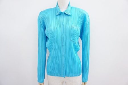 プリーツプリーズのシャツブラウスを出張買取にて買取しました。シャツブラウス×プリーツ素材で、かっちりしすぎず甘すぎない絶妙な組み合わせが素敵なトップスです。涼し気な水色でスッキリ決められます。好印象を狙いたい時の着用にもおすすめです。