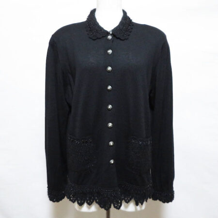 シルクとカシミヤ配合の素材が嬉しいノンノンドールのカーディガンを出張買取ご利用のお客様より買取しました。黒で締まりもありつつ女性ならではの品も感じられるお洋服です。黒はどうしてもダークなイメージになりがちですがスパンコールとパールがあるおかげで程よく優しい印象に!