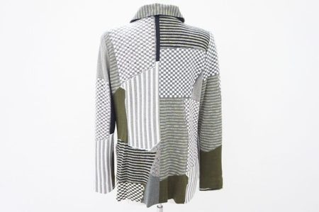チェックやボーダー、無地といった様々な種類の生地を切り替えて使用したパッチワーク風のデザインがユニークです。