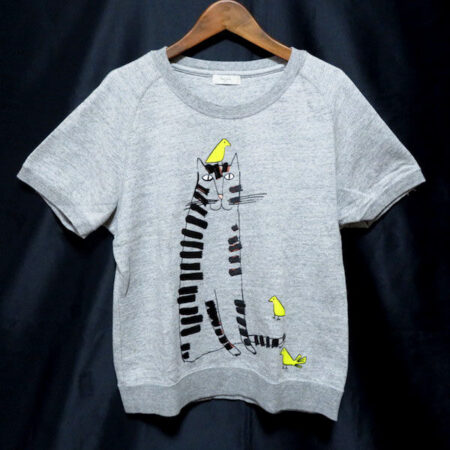 出張買取でポールスミスのトレーナーを買取しました。サイズはMです。グレーと可愛らしい猫と鳥で優しい雰囲気が漂うトレーナー。半袖なので肌寒いような暑い様な日に最適。下に長袖を着つつ楽しむのもいいですよね。