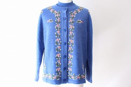 爽やかなブルーニット生地に花の刺繍が華やかに彩り、女性らしくも清々しい印象を与えてくれるような一枚です。