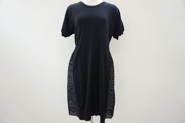 今回ご紹介させていただくのは、ヌメロヴェントゥーノのブラックのワンピースになります。シンプルなブラックのワンピースですが、スカートにレースと花のモチーフをあしらったガーリーなデザインも施されており、可愛らしい仕上がりになっています。程良い丈感と、半袖のスタイルは安心して袖を通すことができるのではないでしょうか。