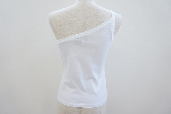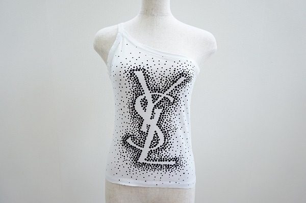 今回ご紹介させていただくのは、イヴサンローランのタンクトップになります。大胆なワンショルダーがセクシーなお品物です。背中もざっくり開いており、アシンメトリーなので小洒落た印象を与えることができます。フロント部分には、イヴサンローランのロゴが大きくデザインされているので、インパクトも絶大です。