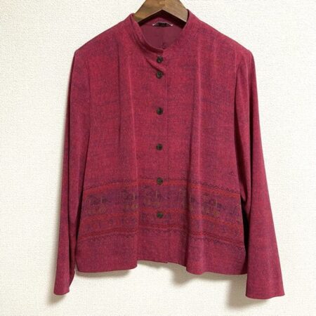 出張買取サービスにて三年坂のジャケットを買取しました。顔の雰囲気もあげてくれる綺麗な赤色。無地ではありますがデザインが上品なのでしっとりいい具合にまとまります。ボトムスが地味でも積極的に着られるお洋服です。