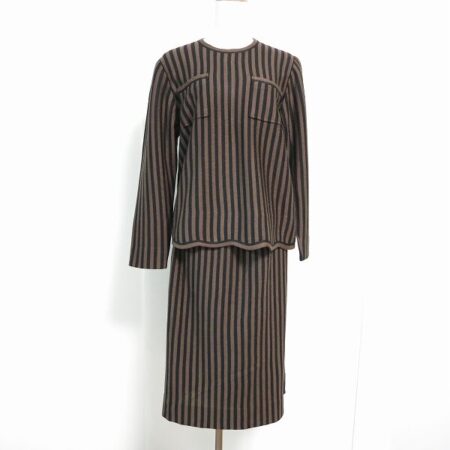 いい意味でストライプならではのさわやかさがない斉藤都世子のセットアップ。出張買取にて買取しました。黒と茶色で大人の魅力を存分に出していただけるのではないでしょうか。