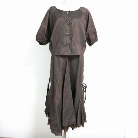 アルバロッサのツーピース サイズ44を出張買取ご利用のお客様より買取しました。上部はシンプル、下部はフリルが大胆に効いた珍しい形のツーピースです。使いやすさは抜群なのに個性も発揮できる嬉しいアイテムではないでしょうか。ブラウンなのでブラックよりも強すぎず柔らかな品格を出してくれます。