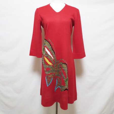はっきりした赤に心を持って行かれる斉藤都世子のワンピース。出張買取ご利用のお客様より買取しました。下部分に光る装飾もどこか逞しくそしてエレガントです。輝く女性にはふさわしい1着ではないでしょうか。黒のパンプスなどで落ち着きを出してもいいですね。