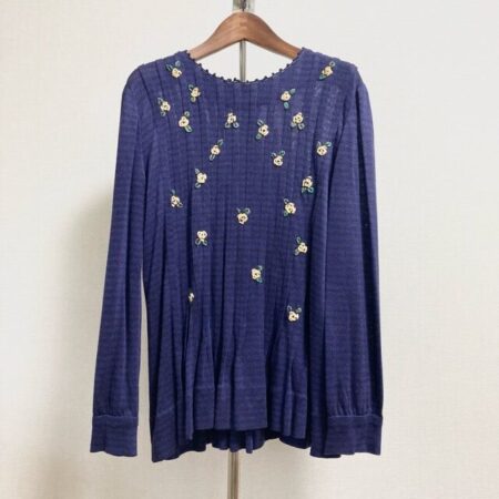 出張買取にて斉藤都世子のセーターを買取しました。紺色にバラの繊細なモチーフがピッタリの1着。ギャザーも細身の印象に近づけてくれるありがたい工夫です。