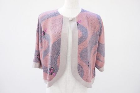 淡いピンクとグレーの配色で優しく、女性らしい落ち着いた華やぎのあるボレロです。