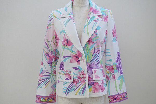 レオナールといえば鮮やかなカラーとフラワープリントが印象的なブランドですね。ピンクやブルーが白地に生えるジャケットはこれからの季節にもぴったりです。ショート丈は様々なコーディネートに使うことができます。レオナールらしさが出ている素敵なお品物です。